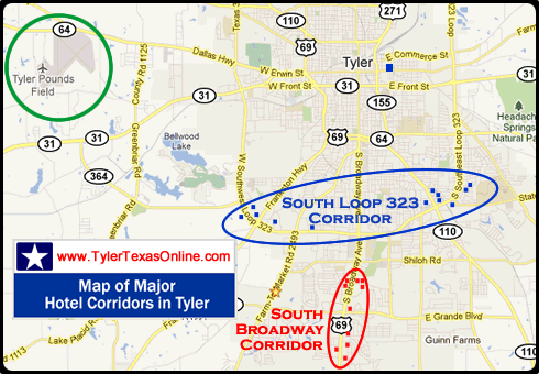 There are no hotels on the airport property, or near the airport. The map below shows the location of the airport in relation to the major hotel corridors in Tyler.